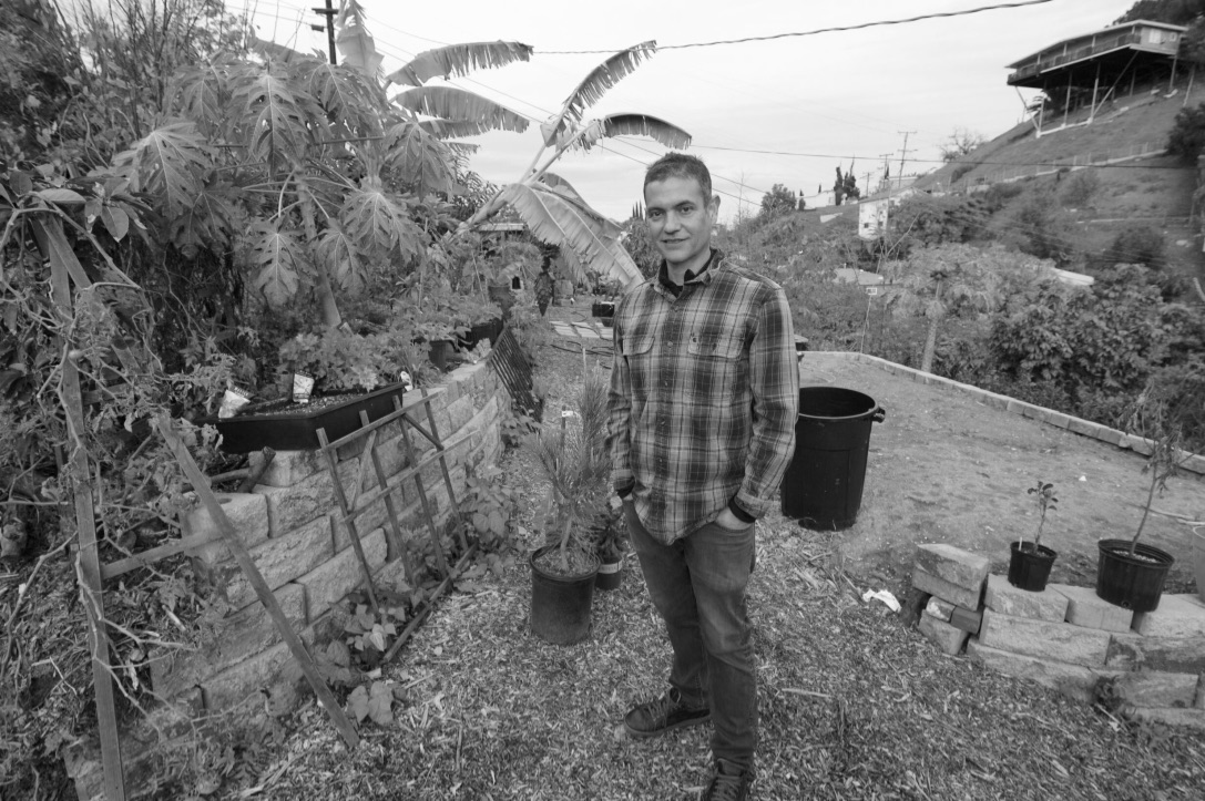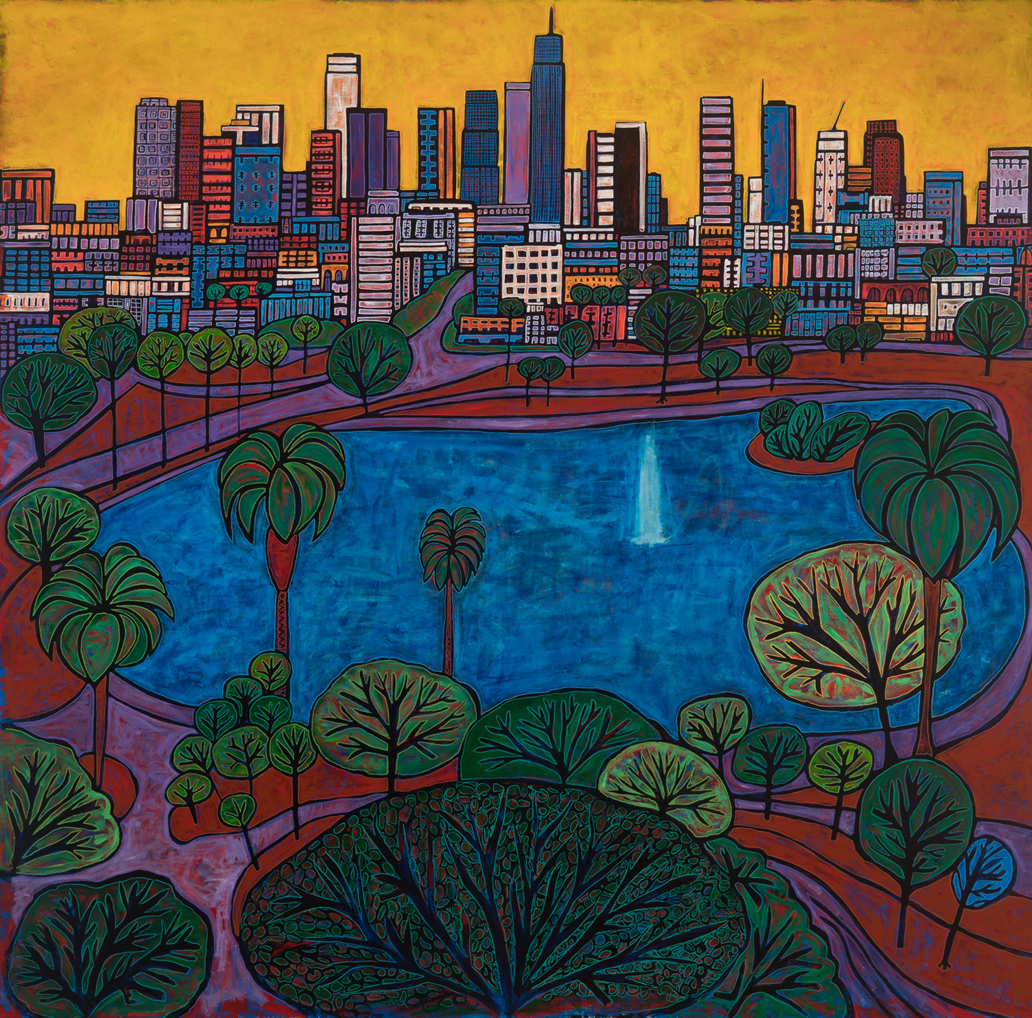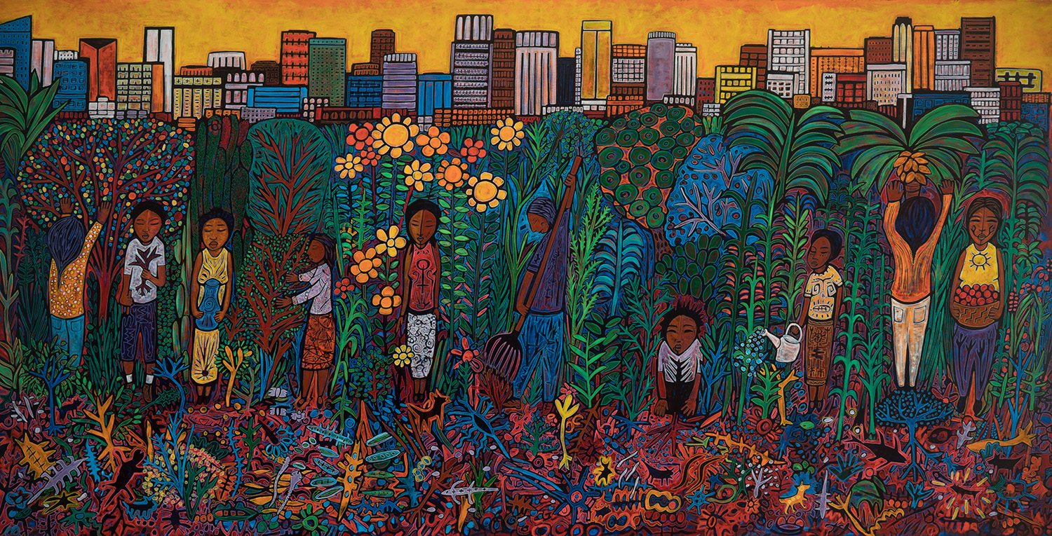 Un entusiasta horticultor, Ramirez se inspira en el extenso jardín perenne que plantó detrás de su casa en City Terrace hace poco más de una década. Con frecuencia señala su interés en los papeles que la historia y la biología del suelo juegan en la supervivencia humana en este planeta. Lo que comenzó como pinturas de árboles y plantas nativas se convirtió lentamente en exploraciones de múltiples capas de la tierra misma, en pinturas como Los Angeles Garden y Above the Clouds, ambas en esta colección. El jardín de Ramirez, fotografiado para esta exposición por el artista de Los Ángeles Gary Leonard, aparece con frecuencia en sus pinturas, proporcionando el telón de fondo mágico frente al cual se desarrollan las historias del artista.