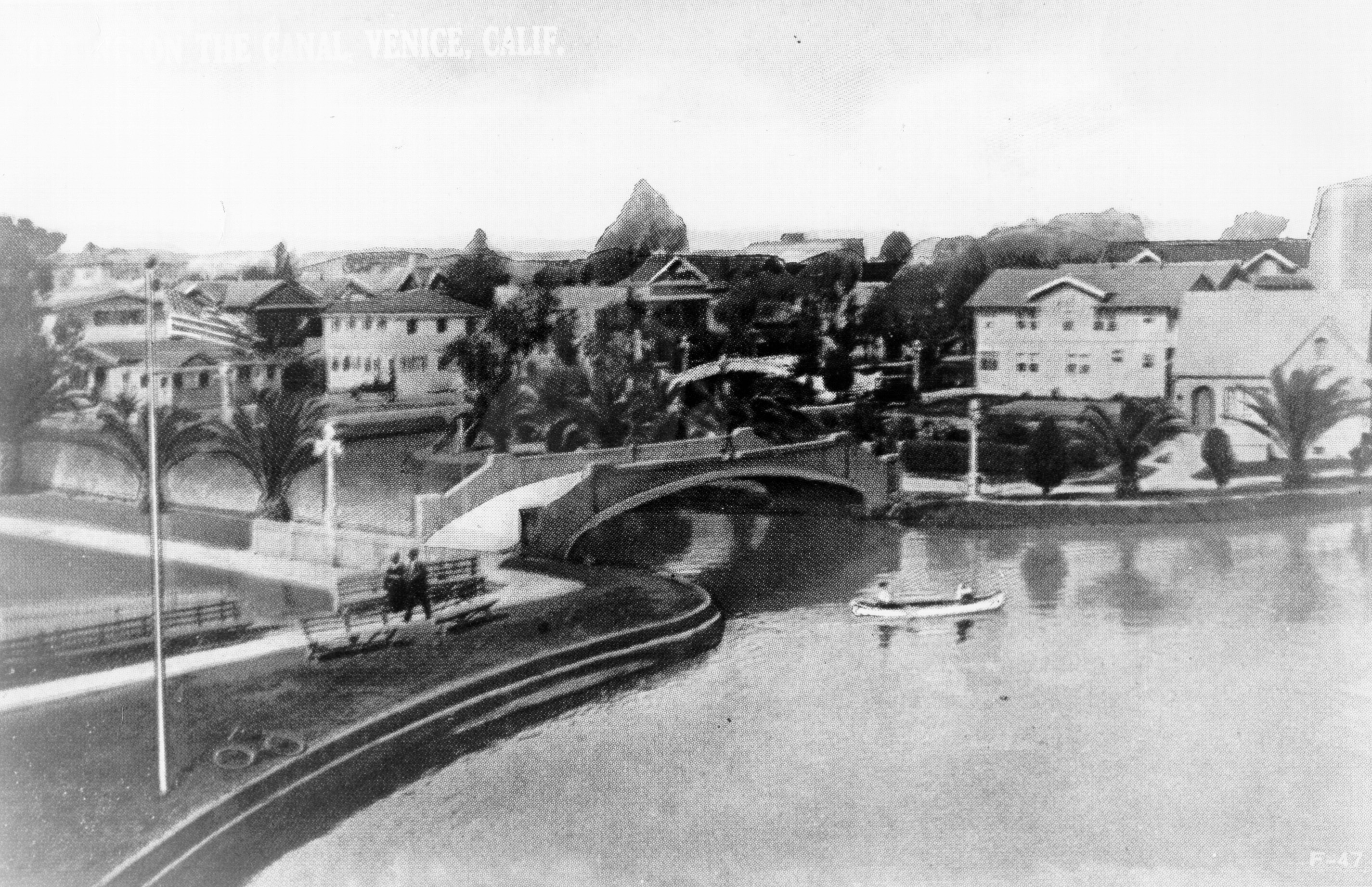 What would one day become the intersection of Main and Windward in Venice was at one time a picturesque landscape of canals dreamed up by Abbot Kinney. Security Pacific National Bank Collection, 1922.