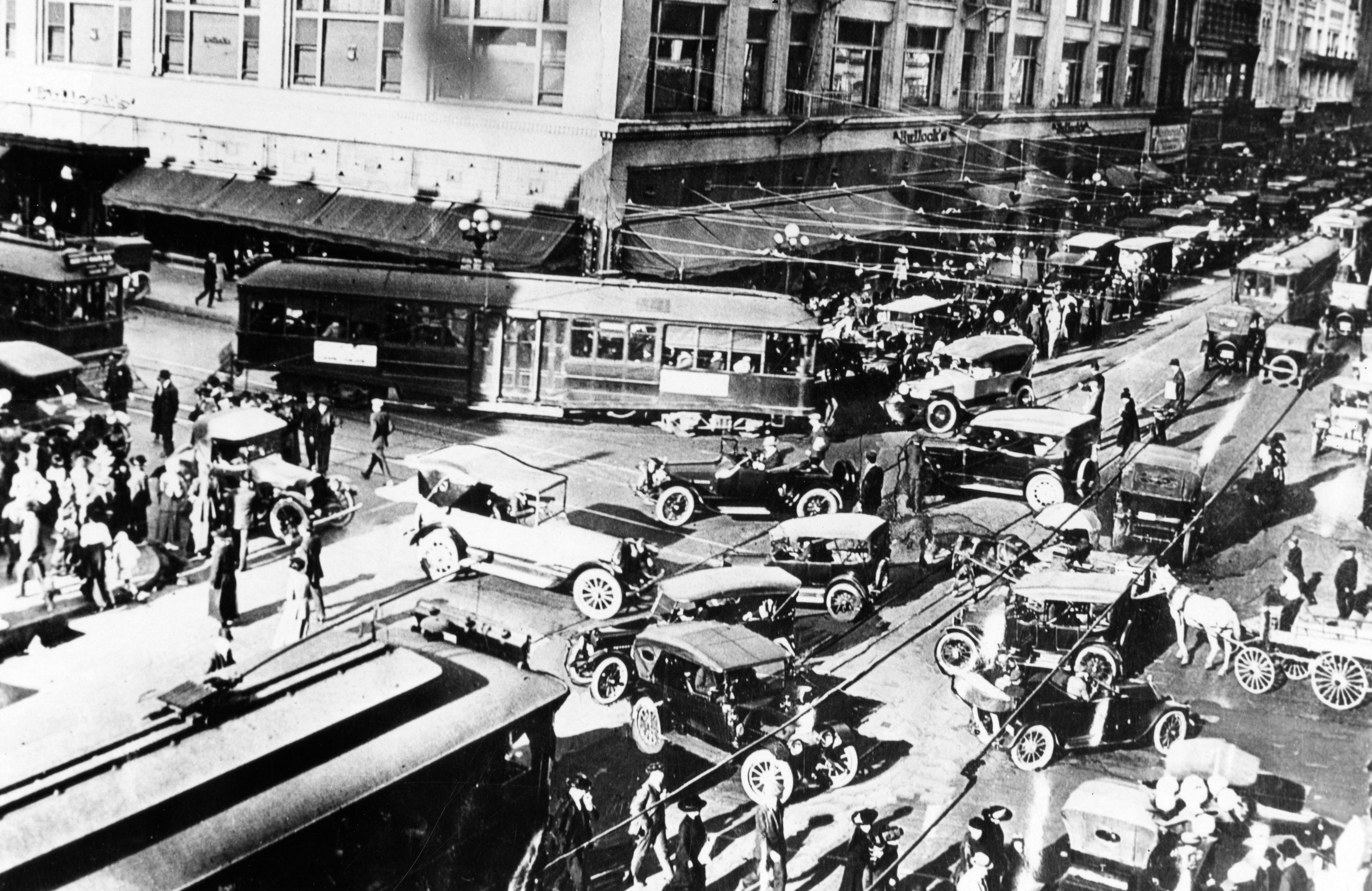 Traffic jam at 7th Street and Broadway, circa 1915. Los Angeles embraced cars so fervently that the city soon ranked second to New York in the number of cars on its streets. (Security Pacific National Bank Collection)