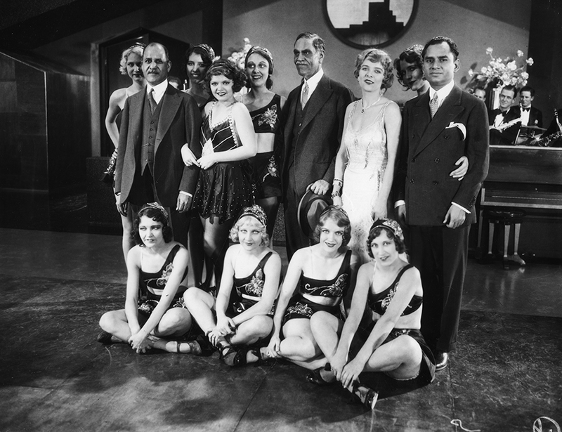 On the set of "The Woman Racket" at Metro-Goldwyn-Mayer Studios, Sir Jagjit Singh of India (in the center with moustache) is surrounded by a group of young starlets and chorus girls. 1930 – Eyre Powell Chamber of Commerce Collection