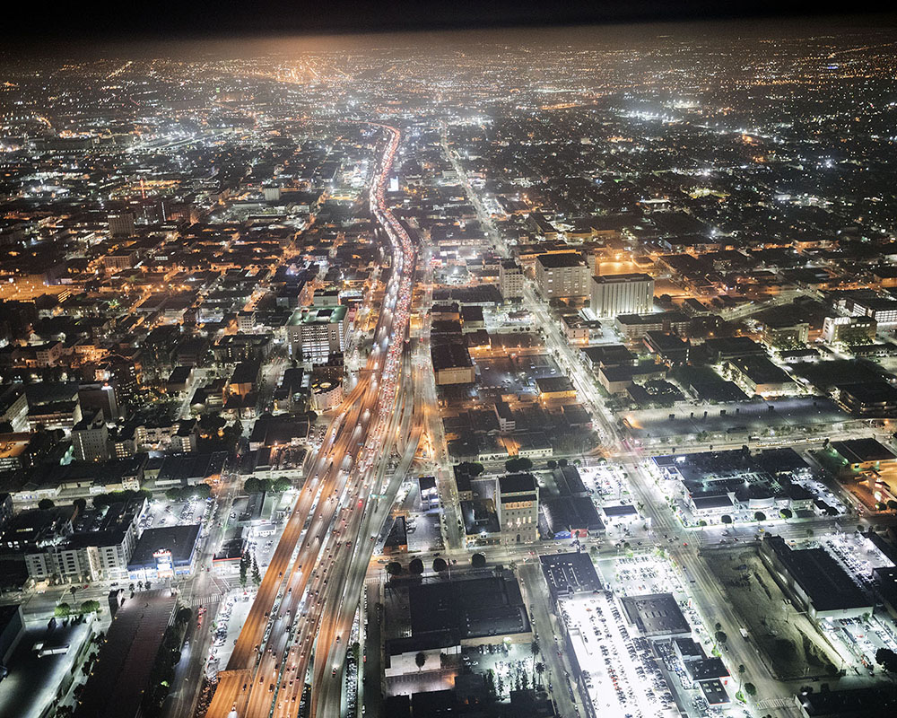 San Francisco photographer Michael Light has captured the city’s ethereal light in a series of aerial photographs, created between 2004 and 2016, both during the day and at night. Often pointing his camera directly into the sun, Light dares the viewer to squint, reducing the city below to a sun-bleached terrain bifurcated by freeways, boulevards, and overpasses. At night, Los Angeles’ sprawling grid turns incandescent, a shimmering carpet rivaling the celestial bodies above as it plunges headlong into the platinum surf of the Pacific Ocean. Los Angeles, in Michael Light’s photographs, is both a real place and a metaphor, referencing the artists of California’s famous 1960s Light and Space Movement, while playing on the myriad cultural myths the city has engendered. Viewed from above, it becomes as non-specific as its ubiquitous glare, enabling the viewer to take the temperature of the place as it relates to the solar cycle and the rhythms of nature.