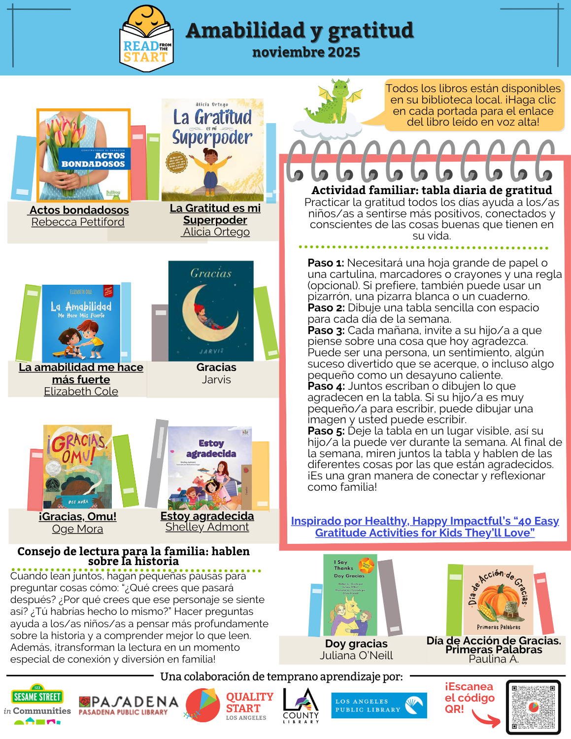 Cada mes, trabajaremos juntos para desarrollar una lista de libros temáticos, consejos de lectura y actividades familiares, todo diseñado para familias con niños desde el nacimiento hasta los cinco años.