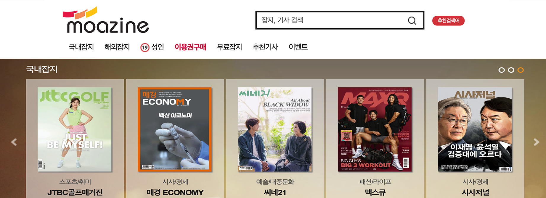 Moazine is a Korean language e-magazine platform that provides access to more than 215 Korean language popular magazines. Archival access is also provided. Titles are available in a broad range of subjects such as politics, economics, lifestyle, fashion, travel, sports, etc.