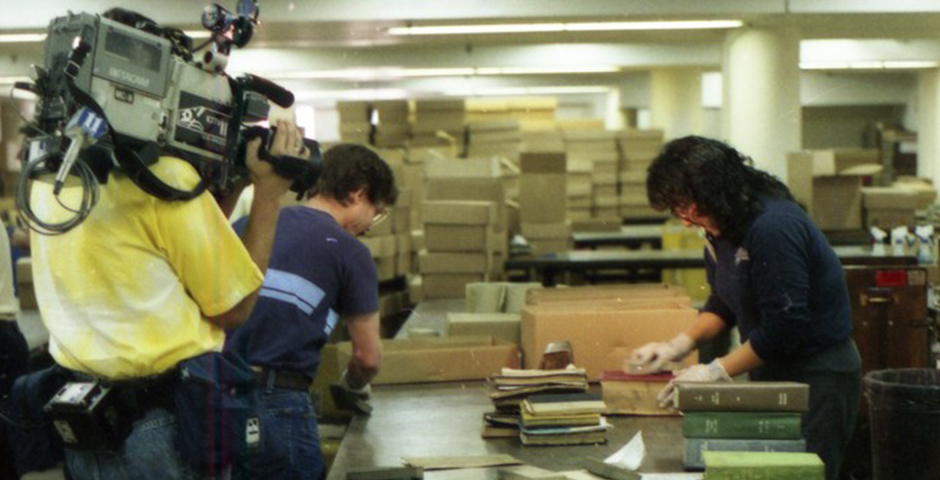 I called the phone number and was told to come to 433 South Spring Street (parking provided). When I arrived, I was sent up to an upper floor of “The Annex”, the building next to the library’s future home. I walked into a huge open space, with people working at long tables. Scattered among the tables were several pallets, piled high with cardboard boxes. I was shown to an empty chair at a table and given my instructions. “Get a box from the pallet. Take out each book, inspect it for damage, wipe it down with this (provided) cloth. Take it to the card catalog (which had been moved to a nook of the warehouse-like space), find the catalog card, put it in the book so it’s visible, and draw a small red (red pencil provided) circle on the title page, return it to the box. When all the box’s books are done, put the box over there (point) and get a new box.” (Next time you pull a book off central’s shelves, look at the title page. If there’s a red circle, you have a survivor in your hands!) Oh, yes. One more detail. “If you don’t find the book’s catalog card, write the title, author, and Dewey number on a slip (small stack provided) and put it in the book.”