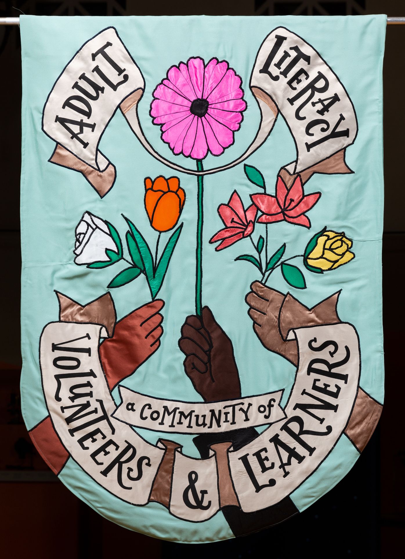 Celebrated for her work in social practice and positive psychology, Bay Area-based artist Christine Wong Yap is known for deeply felt and thought-provoking textiles, publications, flags, billboards, and prints that utilize calligraphy and inclusive design to explore ideas around belonging and its relationship to mental health and well-being. Here, Yap brings the experiences of library-based communities to light, allowing space for reflection on the intangible benefits of being part of a community.