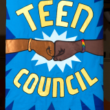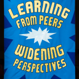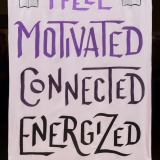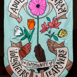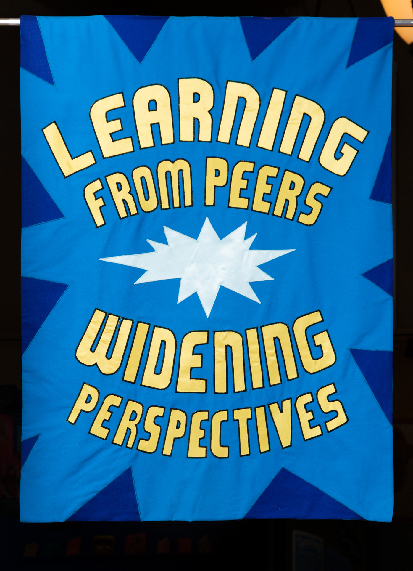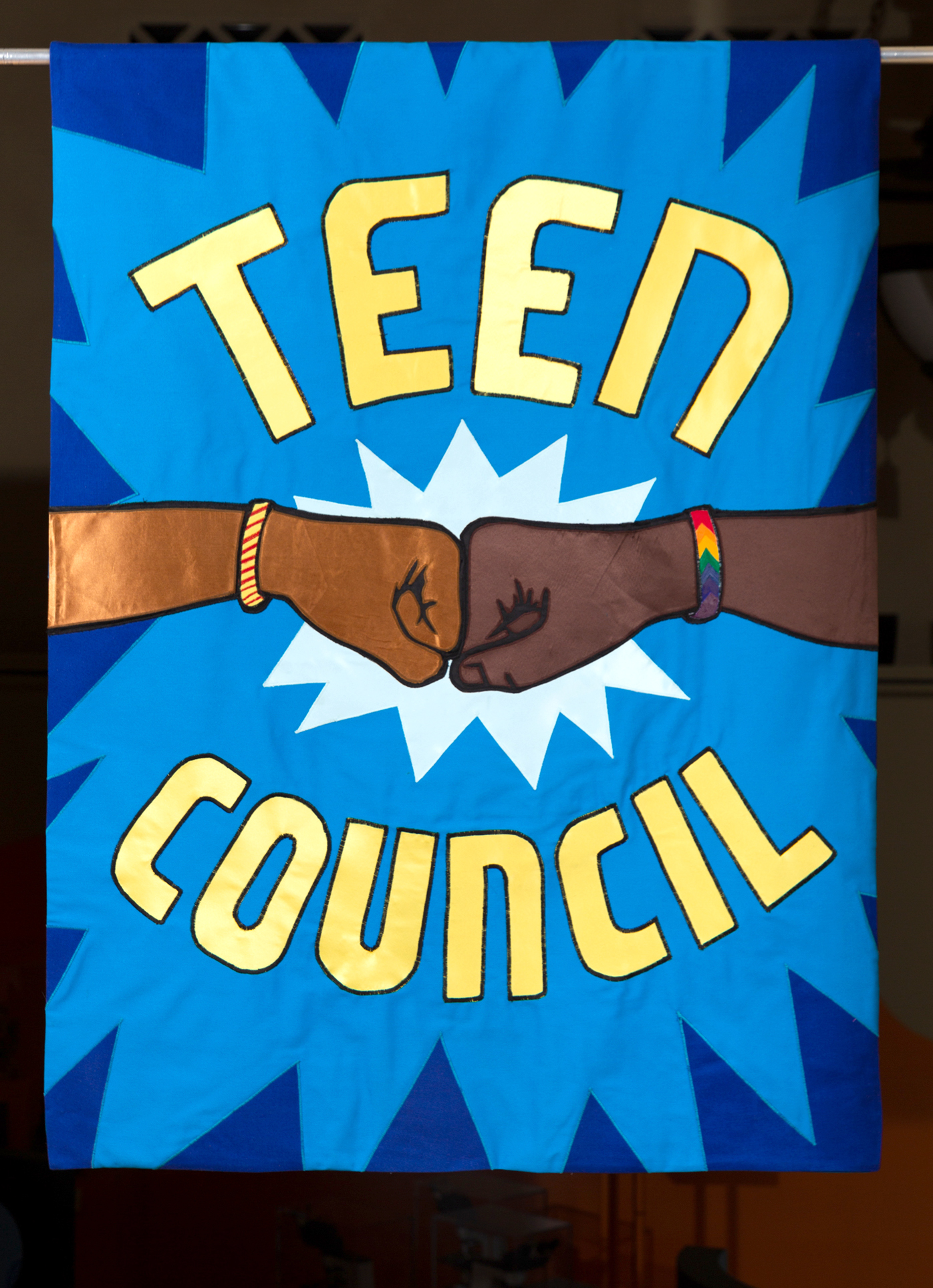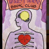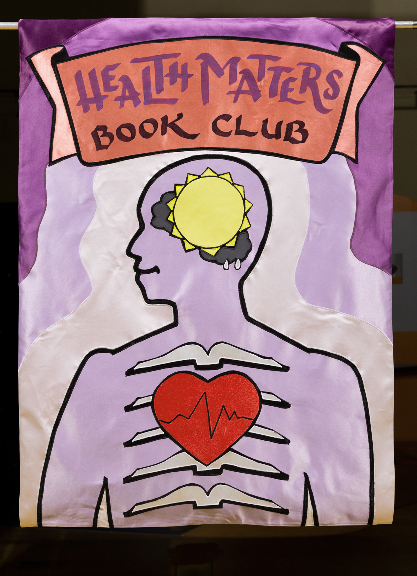 Seven original banners represent groups or communities that meet at a library branch, with the name of the group on the front and a representative quote from a participant on the back. Banner photos by Ian Byers-Gamber.