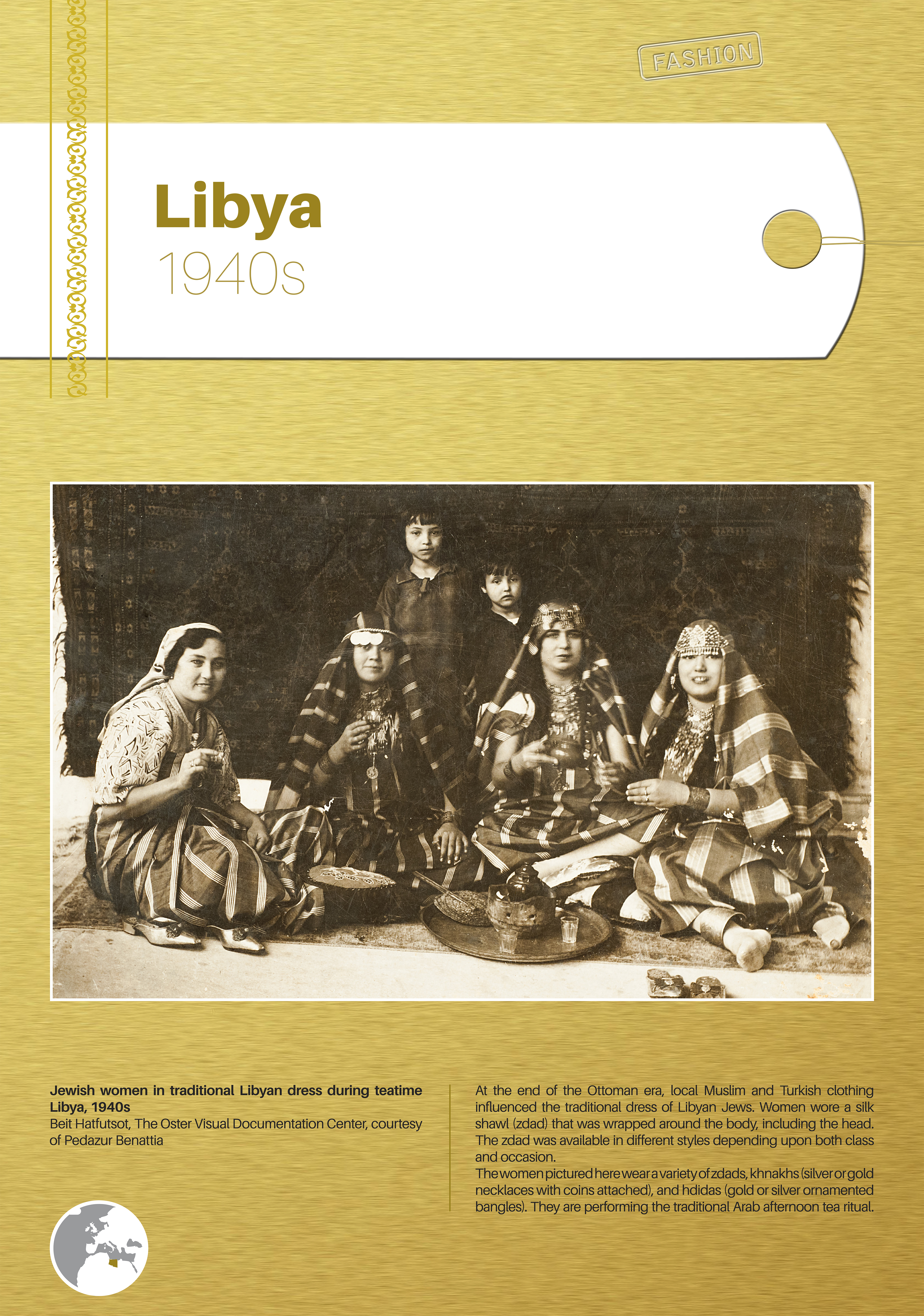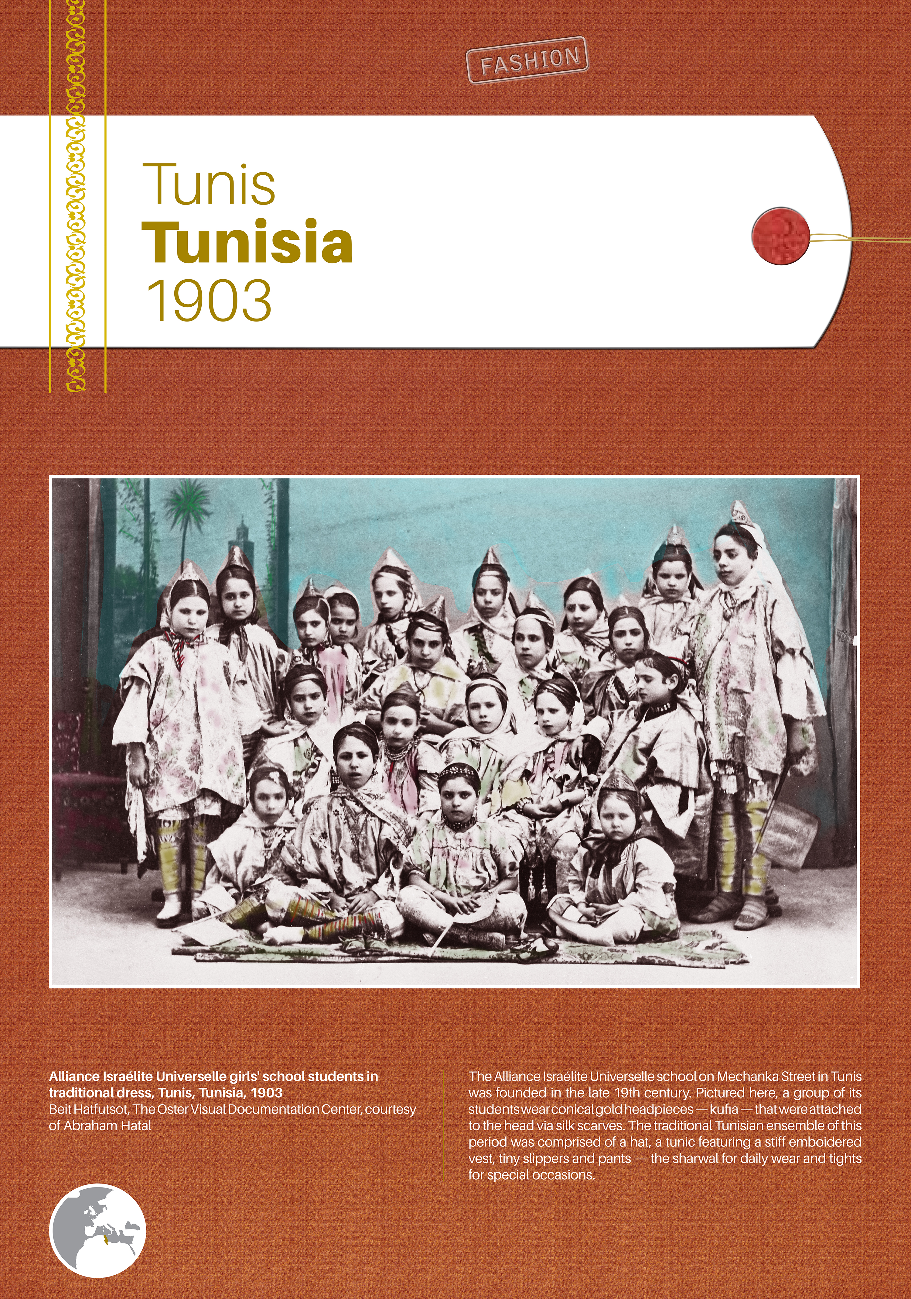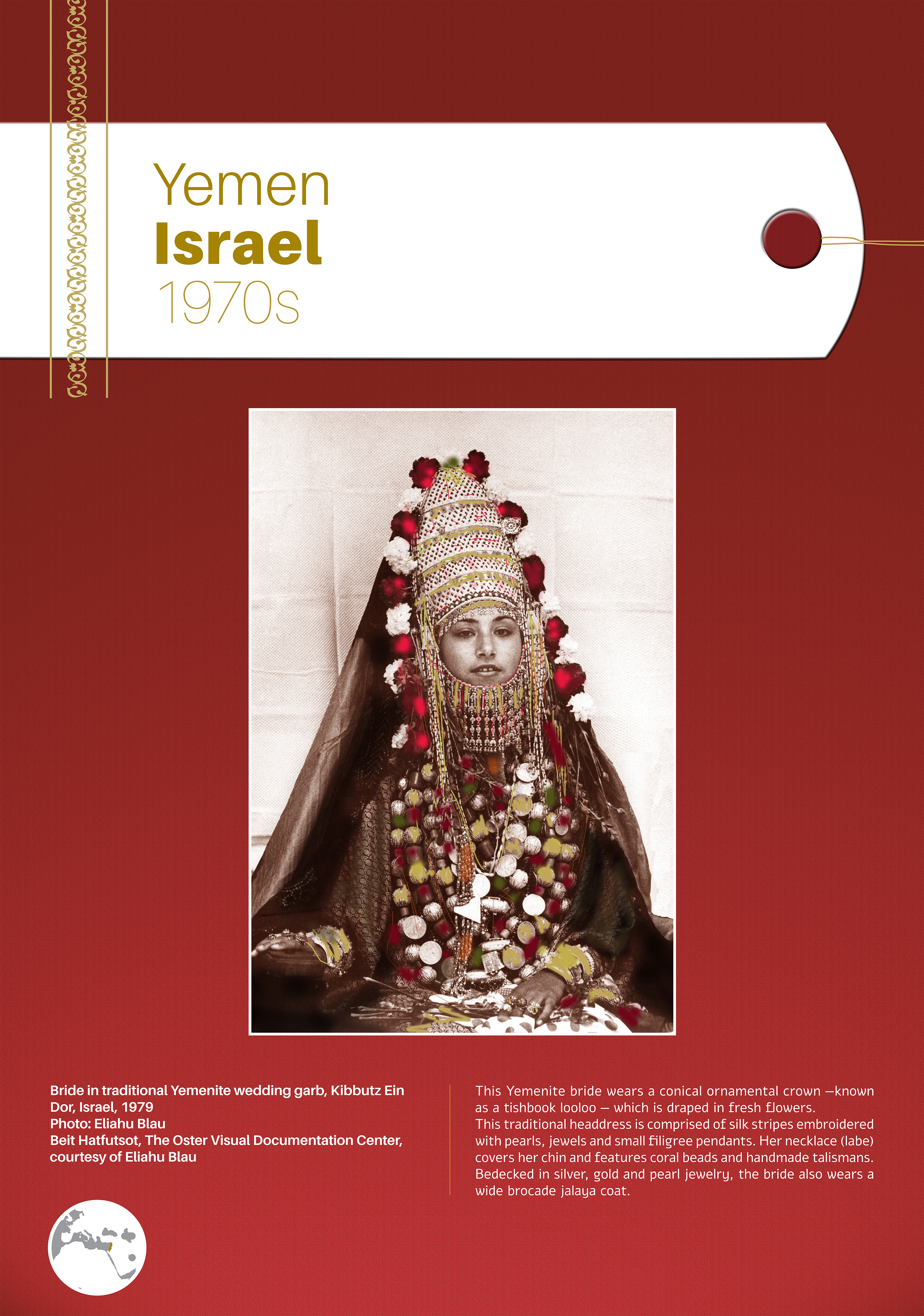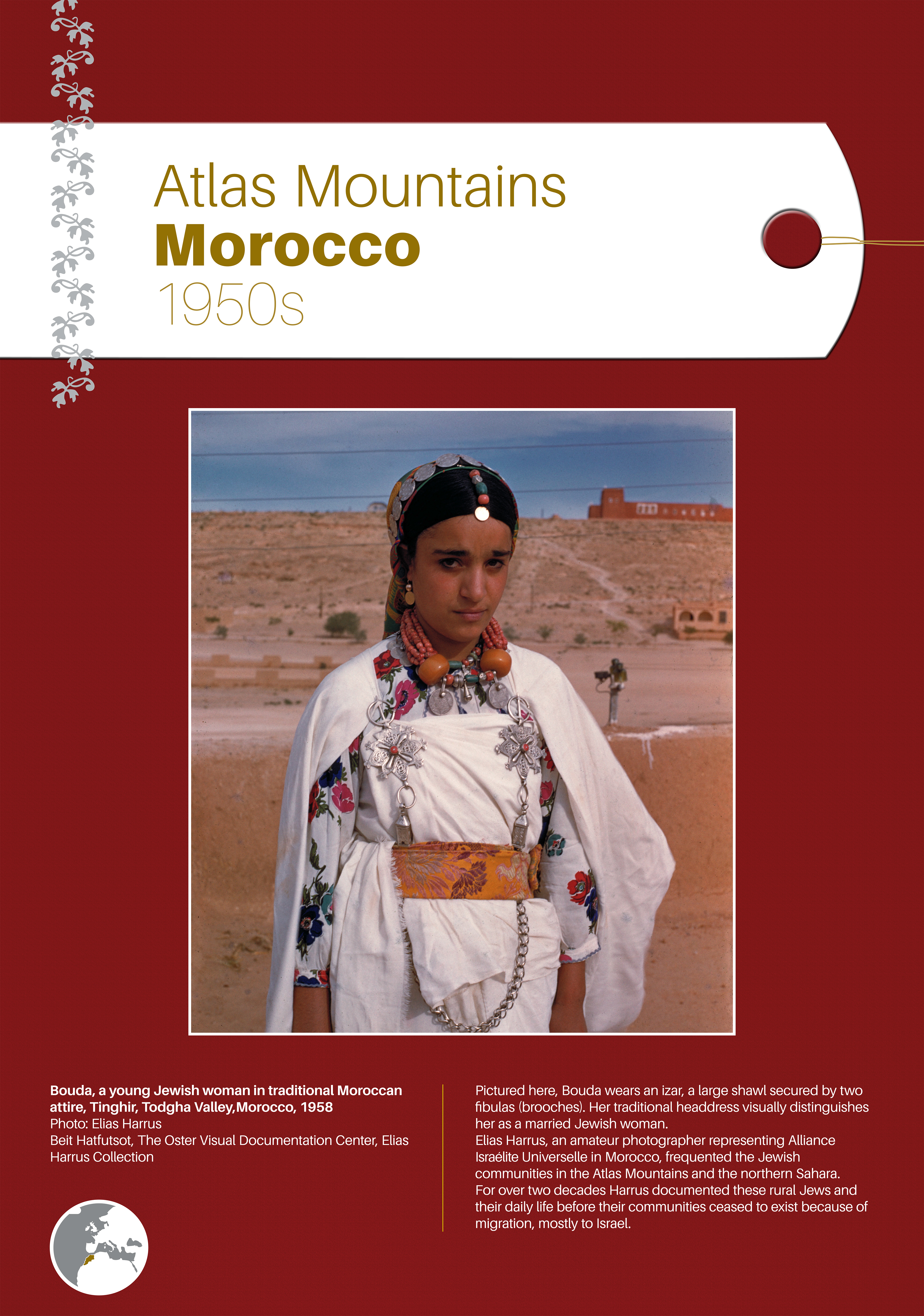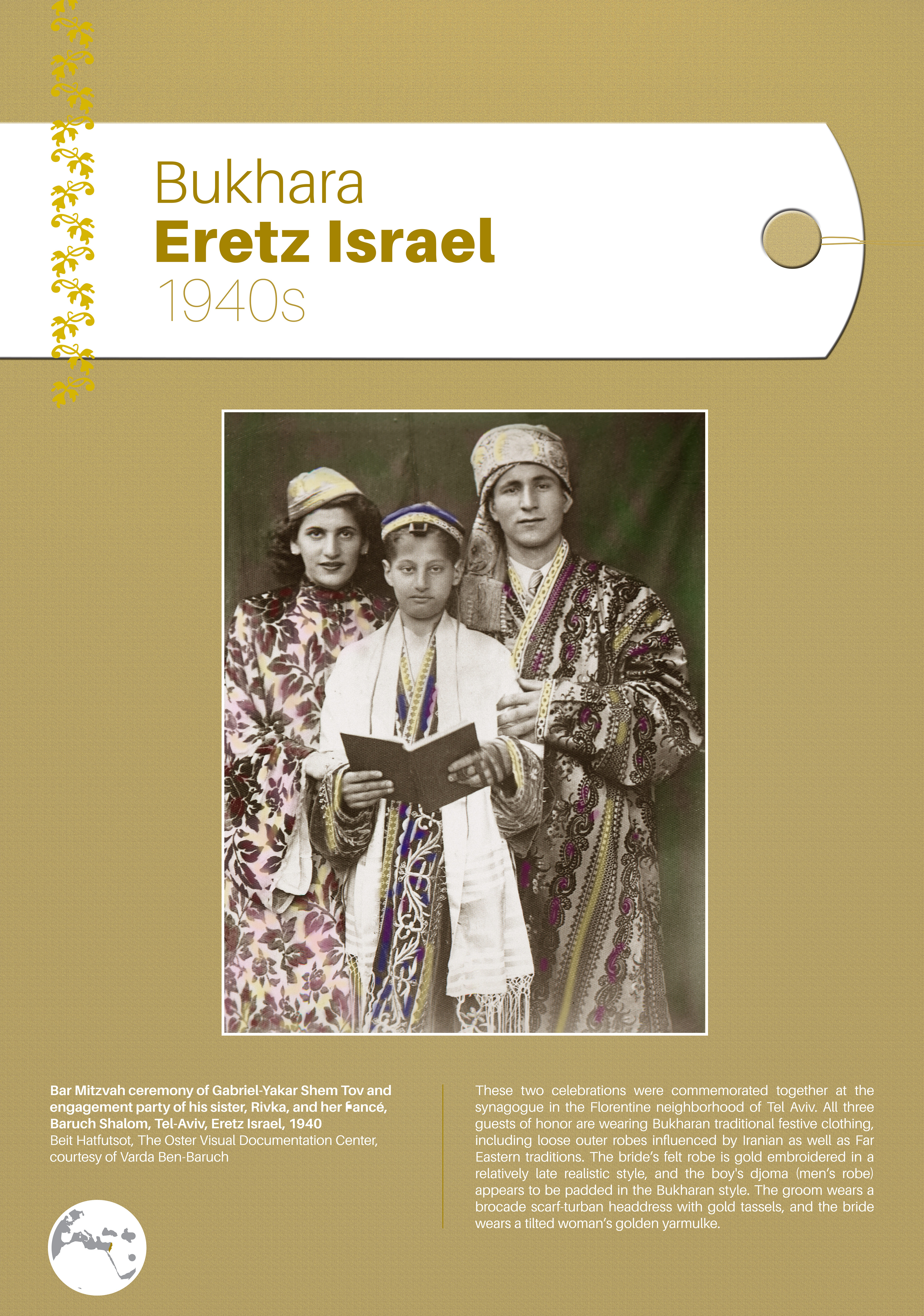 These photographs depict traditional costumes and other ensembles from Jewish communities throughout Europe, North Africa, the Middle East, Israel, and beyond. Showcased are portrait and group photos, master craftwork including embroidery and jewelry, European Jewish school and sports uniforms, festive dress, early Israeli urban and labor clothing, and a famous Israeli fashion brand.