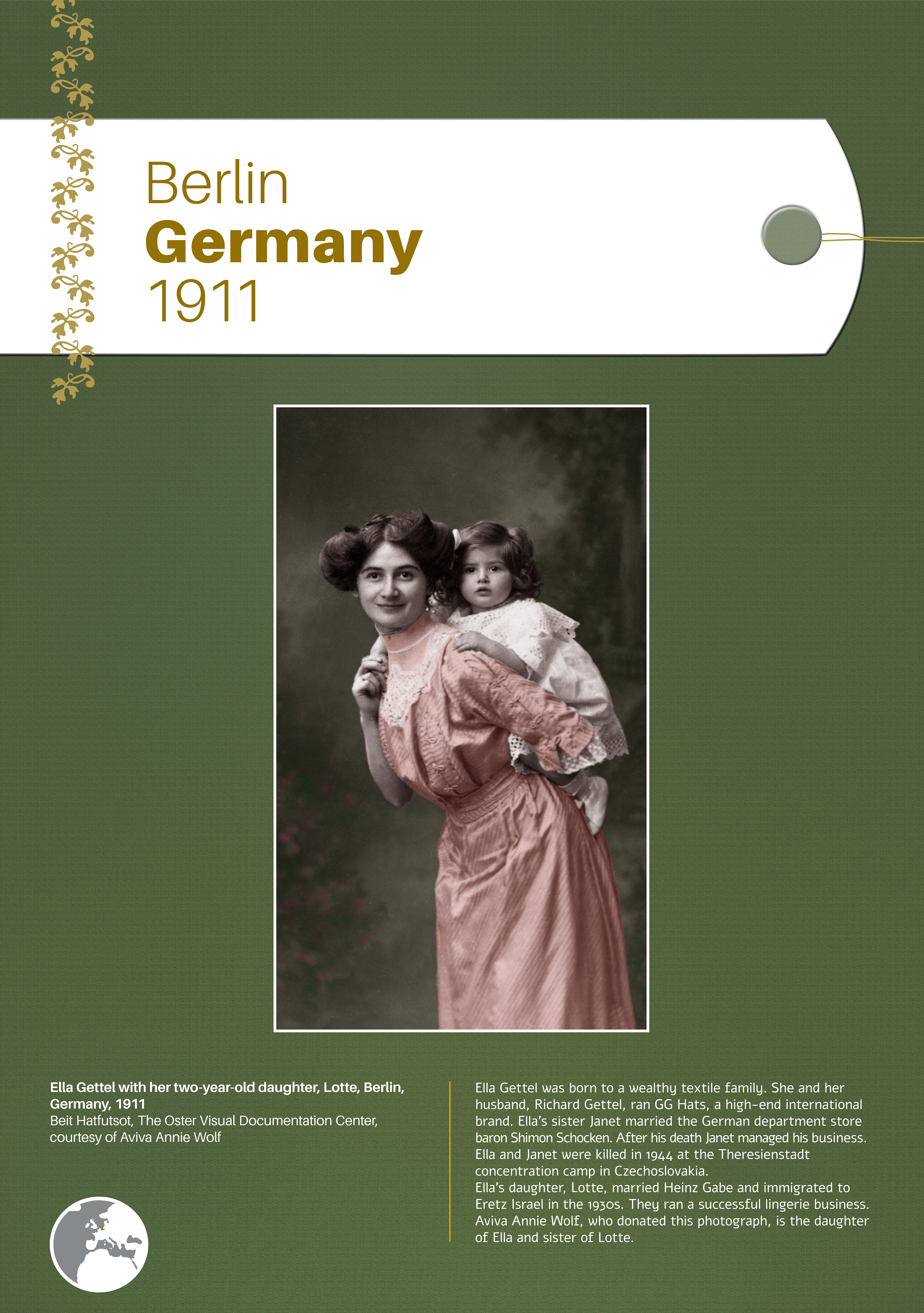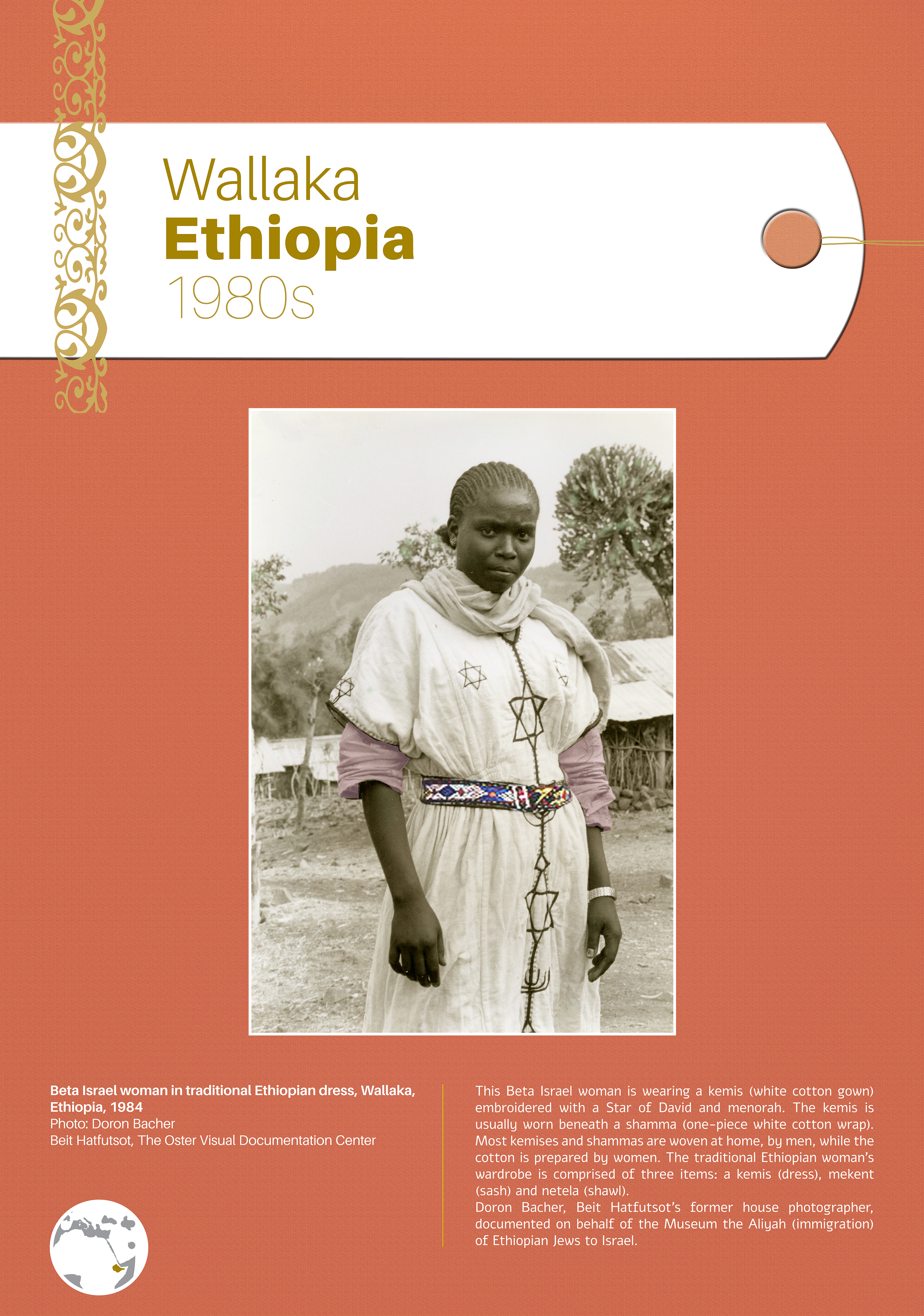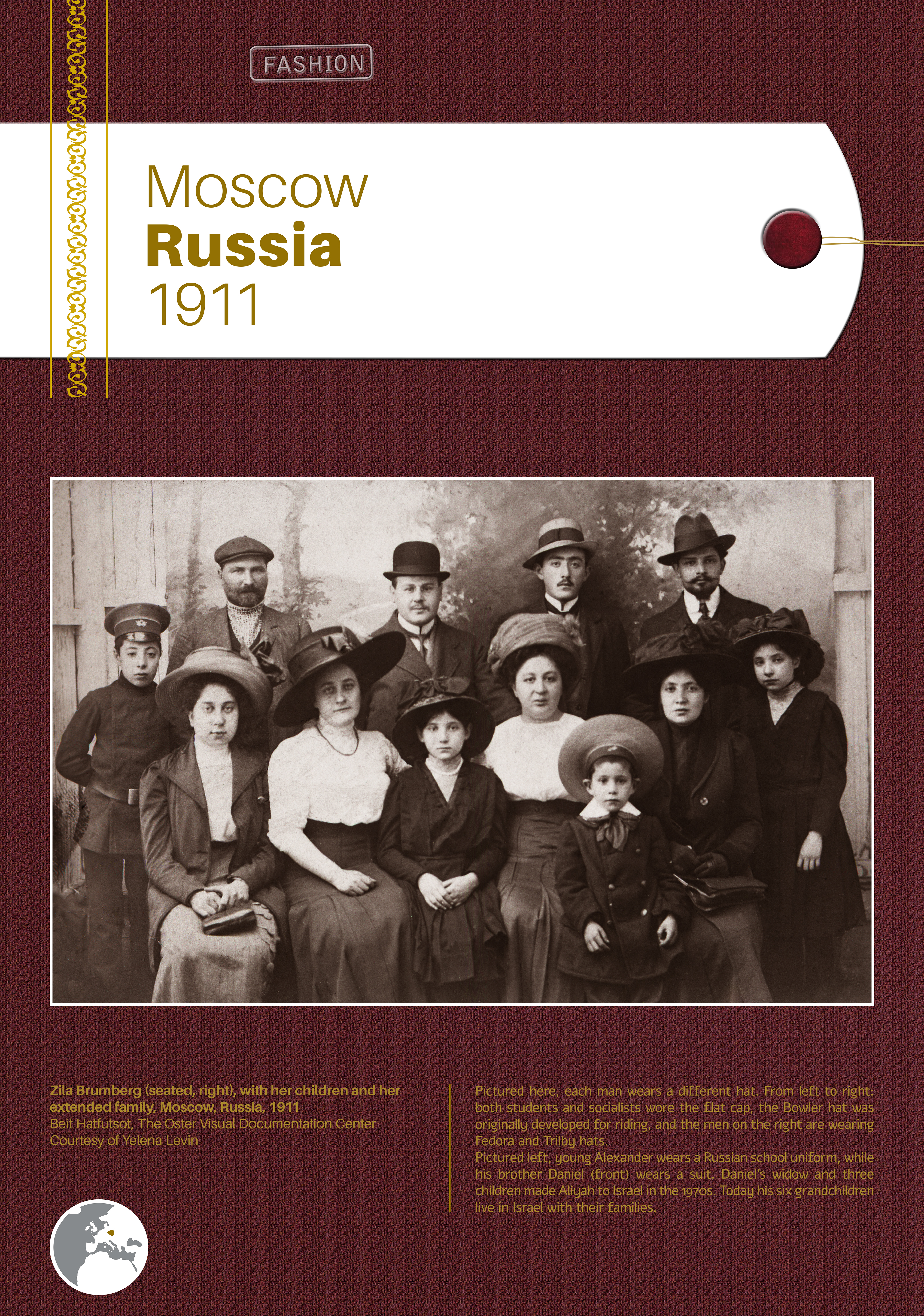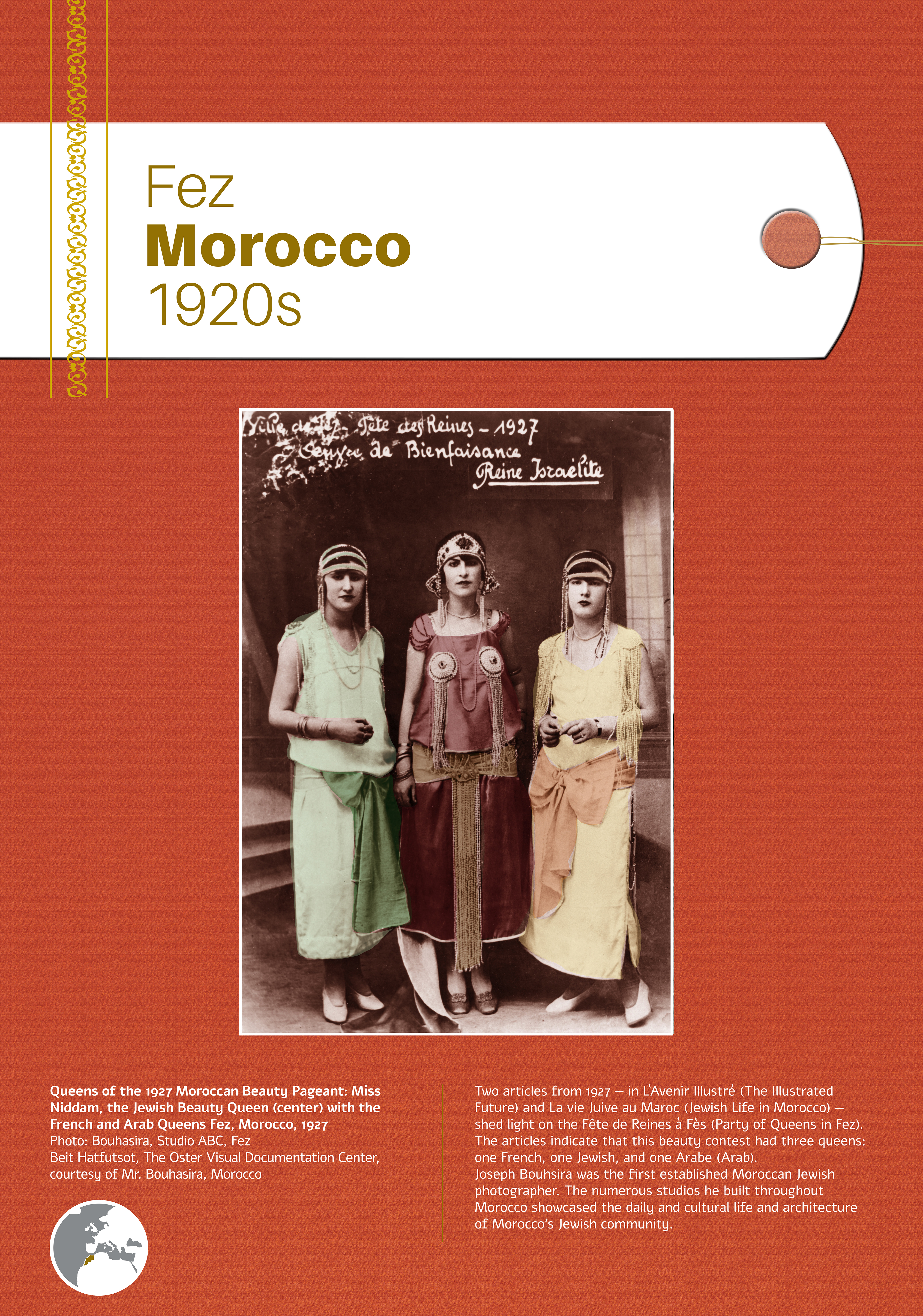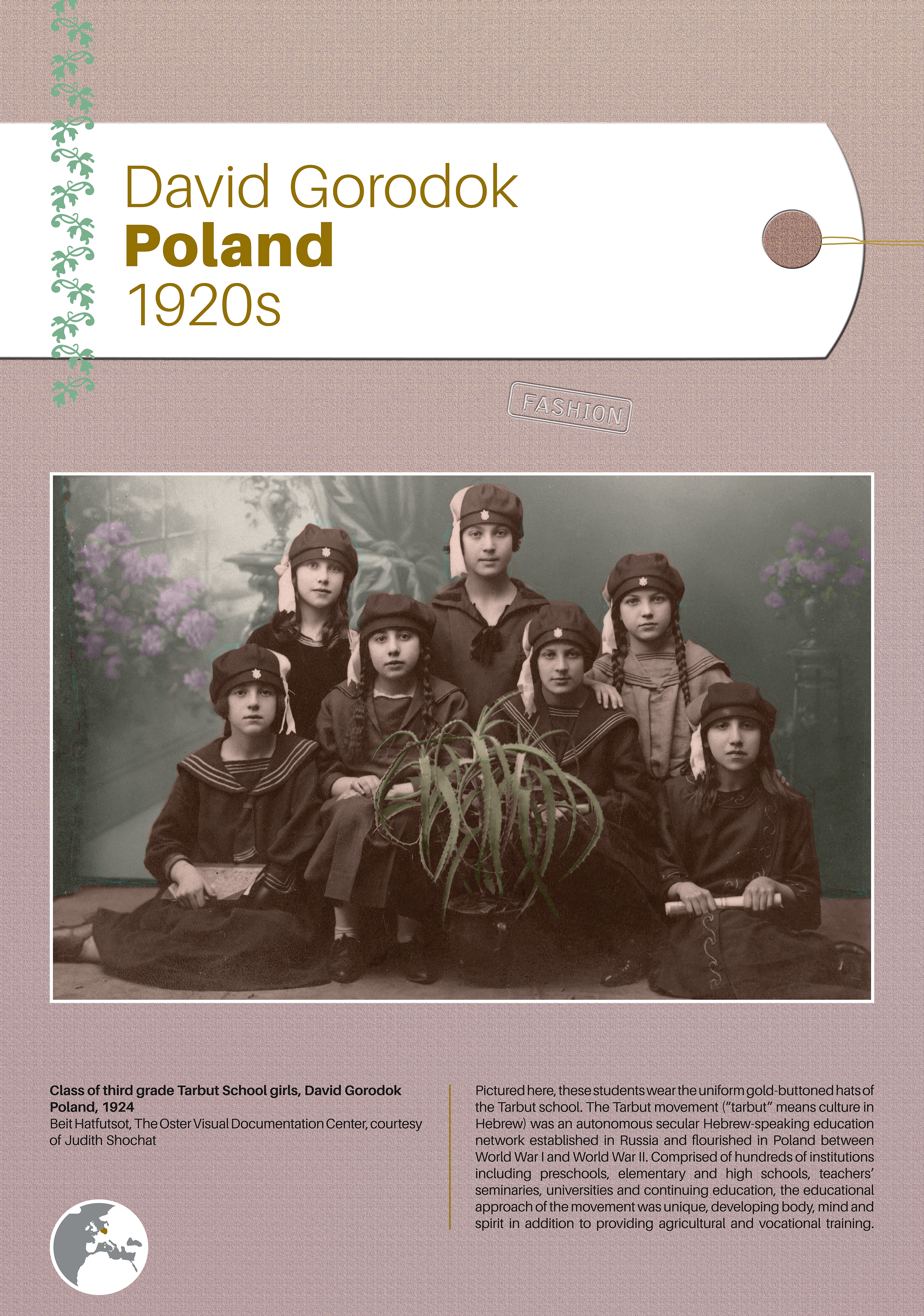 These photographs depict traditional costumes and other ensembles from Jewish communities throughout Europe, North Africa, the Middle East, Israel, and beyond. Showcased are portrait and group photos, master craftwork including embroidery and jewelry, European Jewish school and sports uniforms, festive dress, early Israeli urban and labor clothing, and a famous Israeli fashion brand.