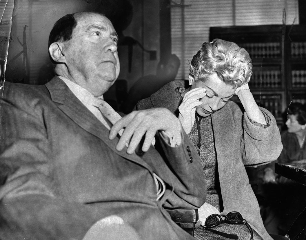 An anxious Lana Turner, seated next to attorney Jerry Giesler, cannot hide her anxiety as she waits to be called to the witness stand in the murder trail of her daughter Cheryl Crane.